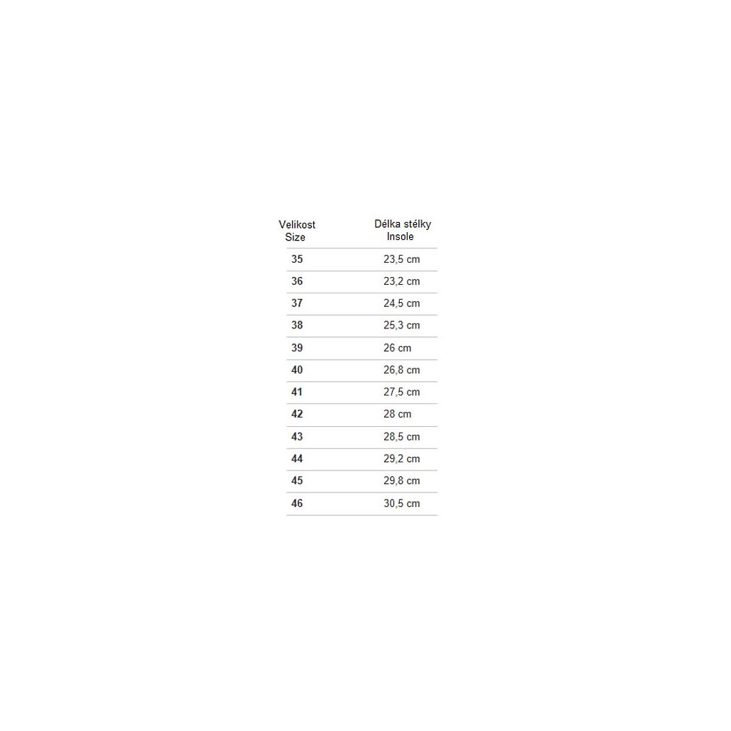 Velikosti odpovídají velikostem EU. Tabulku naleznete v obrázcích. Uvedené hodnoty jsou pouze orientační a s ohledem na konkrétní tvar nohy se může vhodná velikost lišit!