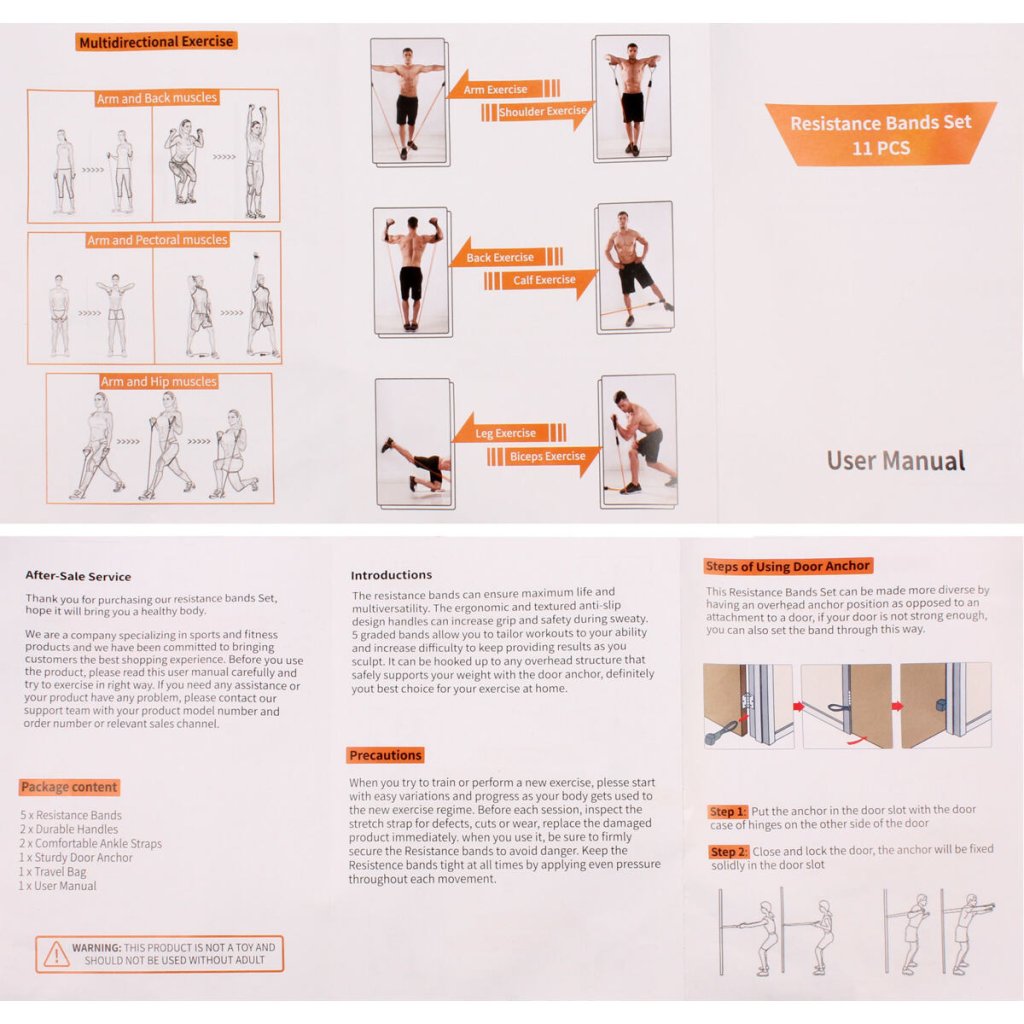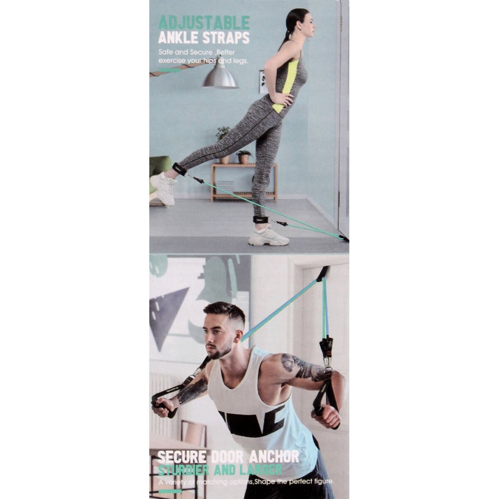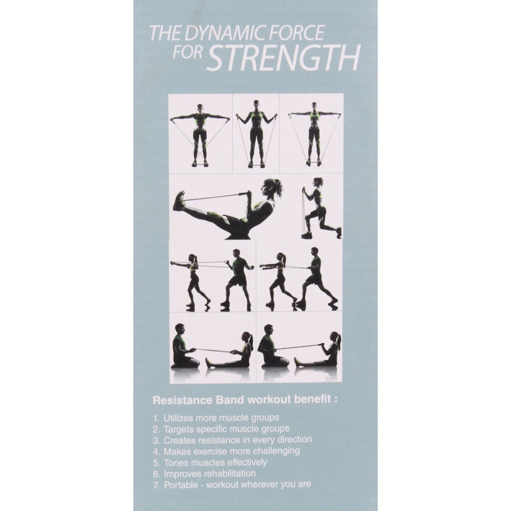 - balení: 5x odporová guma, 2x rukojeť, 2x páska na kotník, 1x dveřní kotva