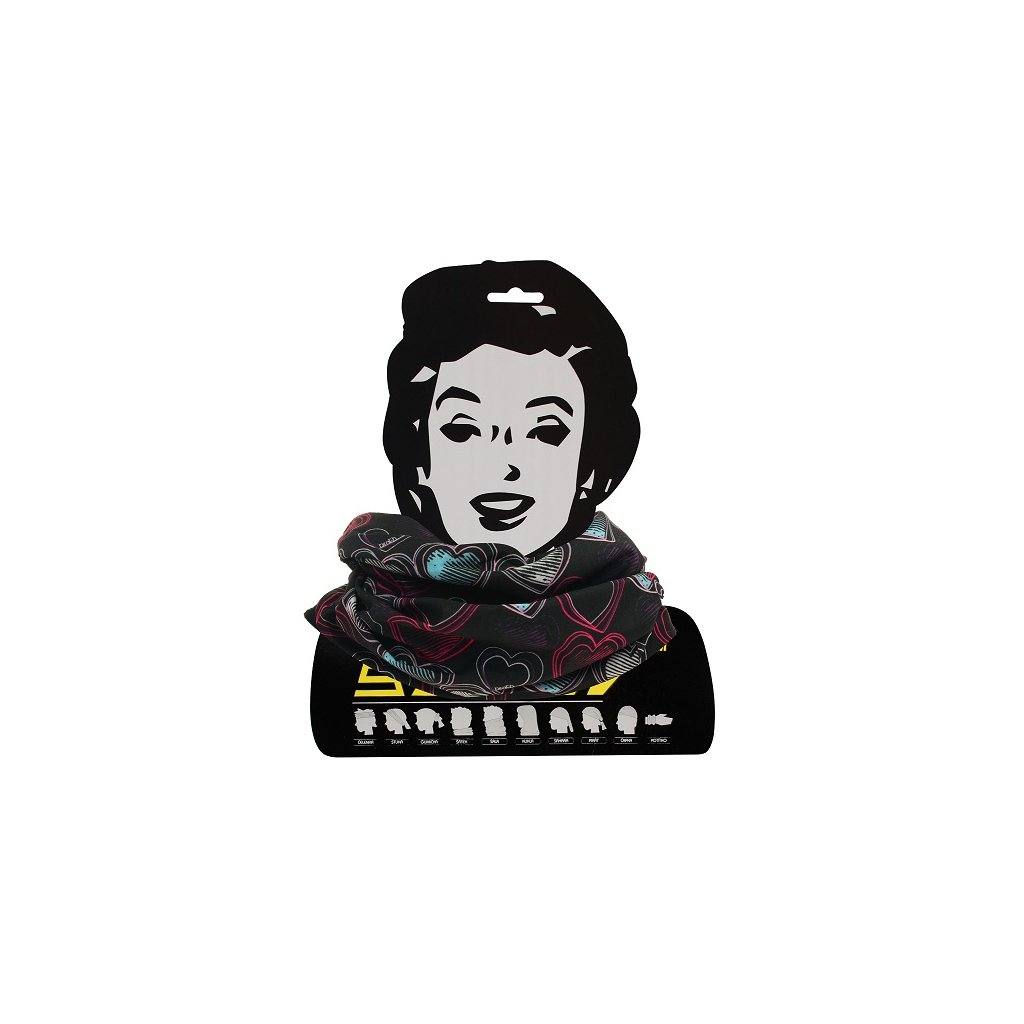 Multifunkční bezešvý šátek z rychleschnoucího elastického materiálu. Vhodný při různých sportovních aktivitách, ale rovněž pro běžné nošení. Chrání hlavu, obličej nebo krk před sněhem, větrem, mrazem, také chladem, sluncem nebo prachem. Vhodný pro celoroční použití. Jedna univerzální velikost, lze prát v pračce, netřeba žehlit. Má tvar tubusu. Slouží jako čepice, kukla, čelenka, šátek, pirátský šátek, ...Multifunkční bezešvý šátek z rychleschnoucího elastického materiálu. Na jedné straně opatřený fleecem.
